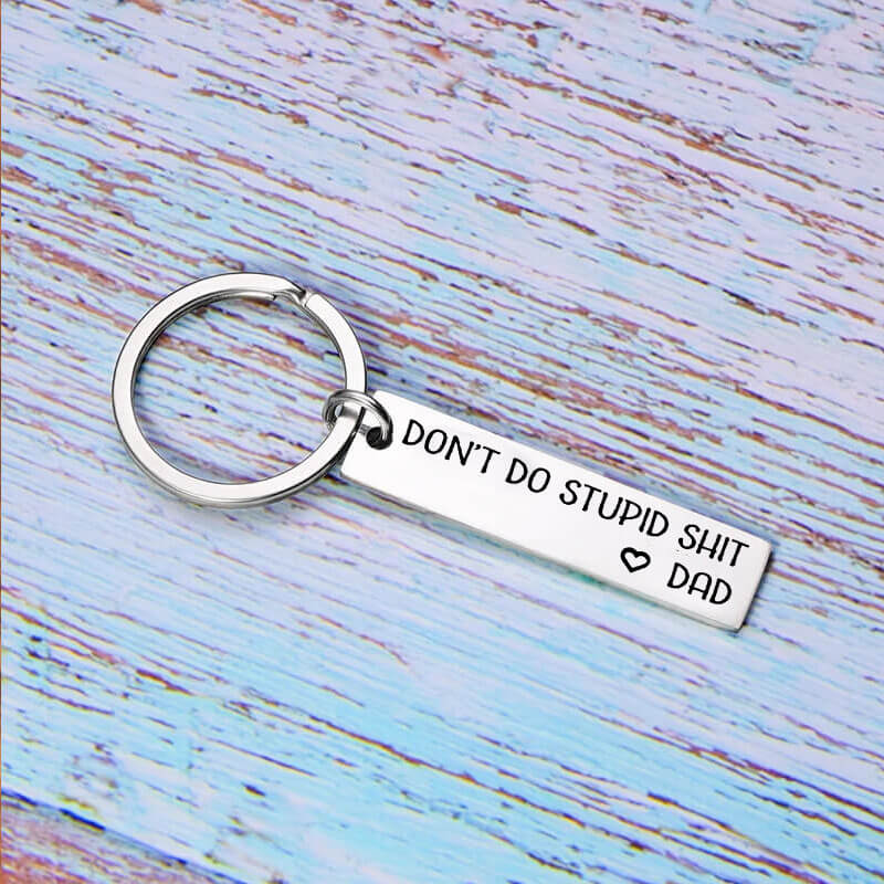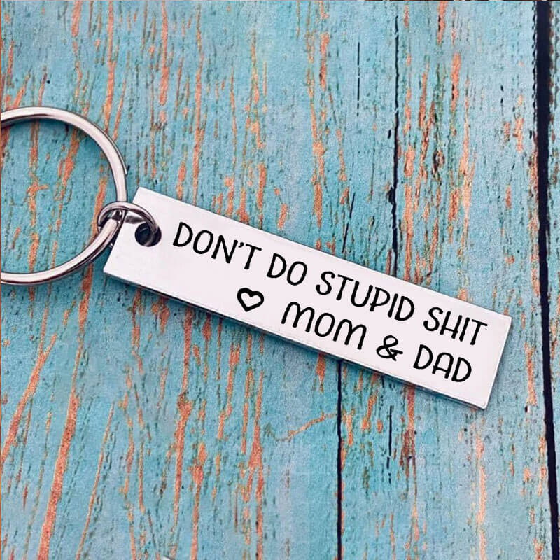 This funny keyring engraved with humor message “Don't Do Stup*d S**t” from Mom/Dad.