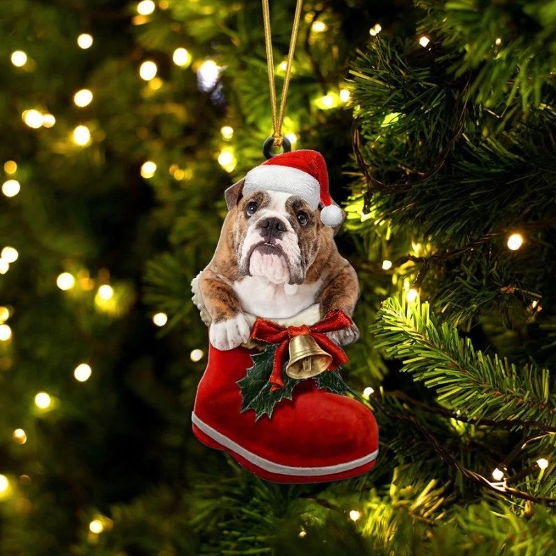 English Bulldog Brindle In Santa Boot Christmas Hanging Ornament SB185